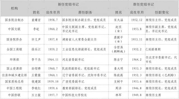 自2月底袁曙宏接任國務(wù)院法制辦黨組書記以來,今年已經(jīng)有包括前文提到的6人在內(nèi)的10位中央單位黨組書記先后履新,涵蓋國務(wù)院組成部委、直屬機構(gòu)、辦事機構(gòu)、事業(yè)單位、群眾團體等各種類型(見表格)。