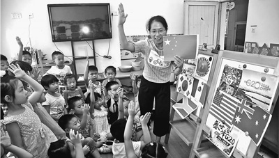 幼兒園老師向孩子們講解G20相關(guān)知識(shí)