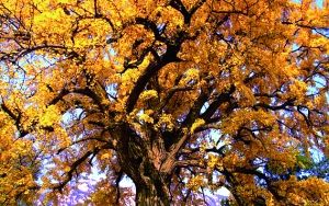 在海淀大覺寺的無量壽殿前,左右各有一株銀杏樹。北邊的是一株雄性銀杏,據(jù)說是在遼代時種植的,雄樹樹齡已逾千年,被稱為千年銀杏,也被譽(yù)為銀杏王。高達(dá)30多米的銀杏枝干挺拔鉆入云天,遠(yuǎn)遠(yuǎn)高出大殿的頂部,濃蔭遮蓋了大半個院子,形狀如同一把金色巨傘,樹干之粗要六七個成人手牽手方能圍攏。南側(cè)的雌性銀杏樹樹冠上掛滿了金黃色的果實,猶如一顆顆金珠隨風(fēng)搖曳。