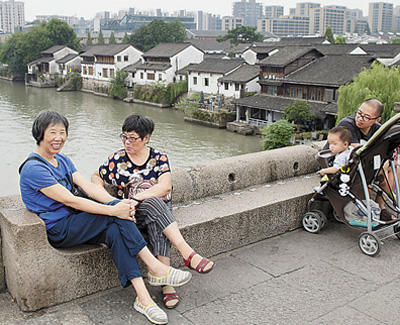 9月1日,人們在京杭大運河上的拱宸橋小憩?!⌒氯A社記者 鞠煥宗攝
