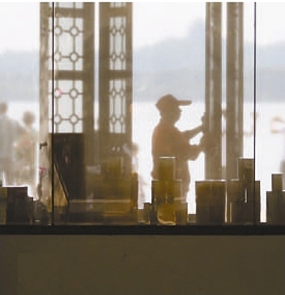 清潔工人在西湖平湖秋月景點工作(8月31日攝)。新華社記者 金立旺攝