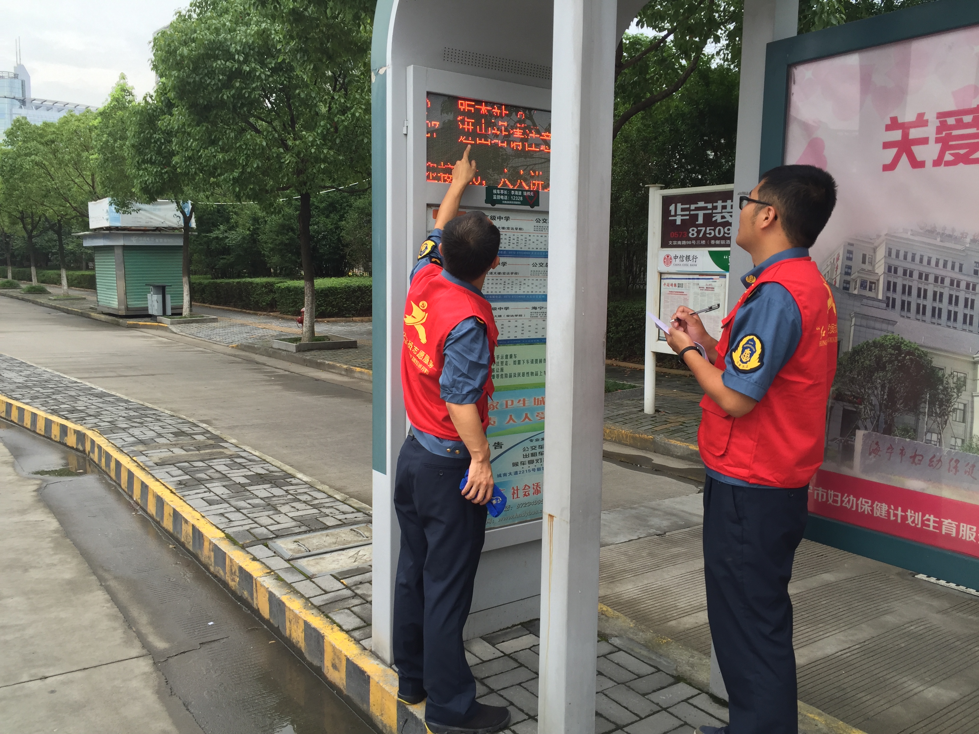 海寧市公交候車亭“亭長制”黨員志愿者檢查記錄故障情況。