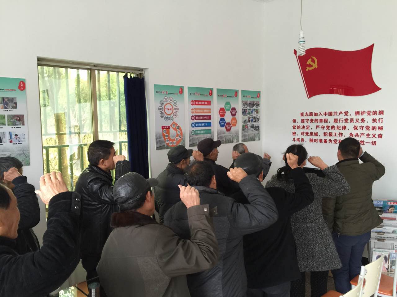 海寧市周王廟鎮(zhèn)長春村麥帛橋片黨員先鋒站組織黨員重溫入黨誓詞。