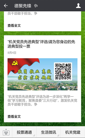 每半年機關(guān)黨員干部向支部匯報履職情況并公示,支部結(jié)合半年度組織生活會進(jìn)行及時評價,通過“個人自評、機關(guān)黨員干部互評、支部審評”等方式評定機關(guān)黨員干部履職表現(xiàn),激發(fā)黨員干部隊伍活力。2016年上半年經(jīng)過前期機關(guān)黨組織考察和申報,“先進(jìn)典型”評委會審核,17名“先進(jìn)典型”候選人名單通過縣直機關(guān)工委“德聚先鋒”微信公眾平臺公布并進(jìn)行投票評選,最終評選出10名先進(jìn)典型。