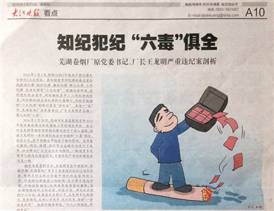 那幅“煙能生錢”的漫畫,刊登在蕪湖市《大江晚報》2016年2月25日10版。一同刊發(fā)的整版文章《知紀(jì)犯紀(jì)“六毒”俱全》,署名為“本報通訊員”,深入剖析了王龍明嚴(yán)重違紀(jì)案。