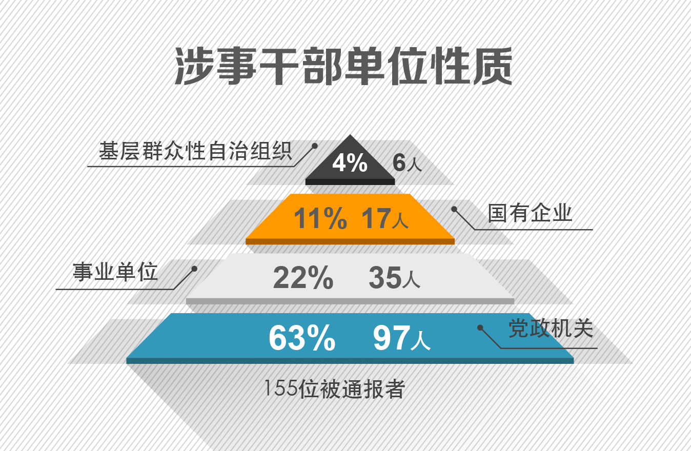 從分布領(lǐng)域看,155位被通報(bào)者,以黨政機(jī)關(guān)干部最多,占六成以上;事業(yè)單位、國有企業(yè)位居其次;村委會(huì)、居委會(huì)干部相對(duì)較少?!?/p>