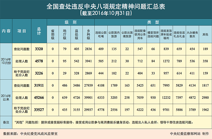 為掌握全國貫徹落實中央八項規(guī)定精神情況,中央紀(jì)委在31個省區(qū)市和新疆生產(chǎn)建設(shè)兵團(tuán)、139個中央和國家機(jī)關(guān)、106個中央企業(yè)、15個中央金融企業(yè)建立了落實中央八項規(guī)定精神情況月報制度。2016年以來,截至10月31日,全國查處違反中央八項規(guī)定精神問題情況如下: