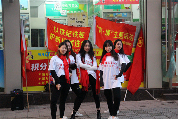 “青年作為家庭的基石,社會(huì)建設(shè)發(fā)展和凈化黨內(nèi)政治生態(tài)的中堅(jiān)力量,換屆選舉年里我們青年更要守住應(yīng)有的責(zé)任,履行好義務(wù),為換屆選舉的順利進(jìn)行保駕護(hù)航……”隨即舞者在一組舞蹈動(dòng)作后,展示出胸前印有“九個(gè)嚴(yán)禁九個(gè)一律”的內(nèi)容標(biāo)示!青春動(dòng)感的步伐以及鮮明的宣傳標(biāo)語(yǔ),引來(lái)周邊群眾紛紛駐足觀看。