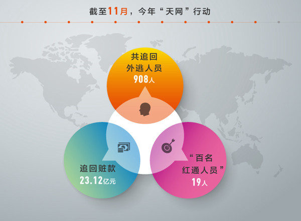 尚有一人在逃,追逃追贓就決不停止。隨著紅色通緝令通緝的頭號嫌犯楊秀珠的投案自首,"百名紅通人員"已有37人到案。截至11月,今年"天網(wǎng)"行動共從70多個國家和地區(qū)追回908人,其中外逃國家工作人員122人,追回贓款23.12億元,"百名紅通人員"19人。
