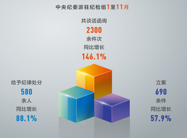 按照中央紀(jì)委向中央一級黨和國家機關(guān)派駐紀(jì)檢機構(gòu)的方案,完成47家派駐紀(jì)檢組組建工作,選好干部、配強班子。派駐監(jiān)督作用不斷突顯,查處違紀(jì)問題力度持續(xù)加大。中央紀(jì)委派駐紀(jì)檢組1至11月共談話函詢2300余件次,立案690余件,給予紀(jì)律處分580余人,同比分別增長146.1%、57.9%、88.1%。