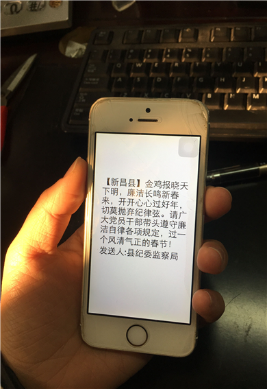 就在春節(jié)假期前的最后一個(gè)工作日,新昌縣全縣機(jī)關(guān)干部收到了縣紀(jì)委發(fā)送的廉潔短信,要求黨員干部帶頭遵守廉潔自律各項(xiàng)規(guī)定,過(guò)一個(gè)風(fēng)清氣正的春節(jié)!