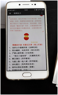 舟山定海區(qū)城東街道紀工委將將黨紀條規(guī)、法律術語、勤政廉政故事人物等內容融入燈謎中,別出心裁地通過微信群組、微信公眾號、政務網站,等平臺向全社會傳播。
