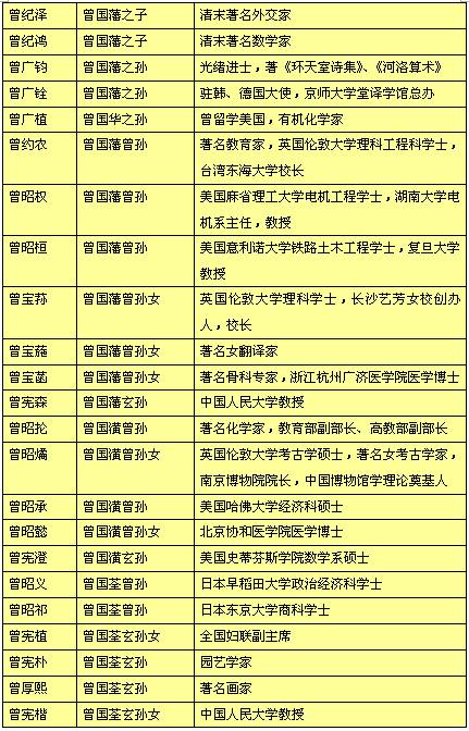 曾家后裔恪遵先祖遺言,遠(yuǎn)離爾虞我詐鉤心斗角的政界、軍界,但他們?cè)诮逃?、化學(xué)、文學(xué)、藝術(shù)等多個(gè)領(lǐng)域都取得了不凡的成就,實(shí)現(xiàn)了曾國(guó)藩“長(zhǎng)盛不衰,代有人才”的遺愿。