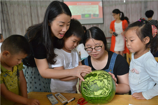 市幼兒園老師與學(xué)生共同雕刻家訓(xùn)瓜燈。