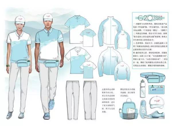 G20峰會志愿者服飾,巧妙將杭州山水相依,湖城合璧的景致融入到了設(shè)計元素中,并以G20會標為源頭,借助流暢水紋依身體與服裝的結(jié)構(gòu)「順勢而行」,肩膀至腰間的線性聯(lián)動展現(xiàn)京杭大運河和錢塘江交匯于杭城,象征著人與自然的緊密依存;以會標為視覺中心點延伸,寓意以杭城為起始點,鏈接世界,匯聚各國首腦,對話合作,共創(chuàng)未來。同時,領(lǐng)口與袖口精致的裝飾細邊,增添了志愿者與環(huán)境氛圍的交相融合。