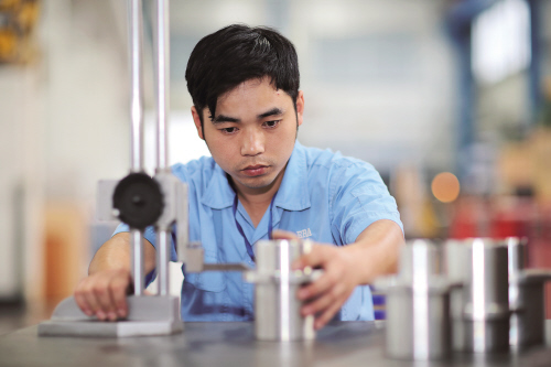 2010年8月,陳小兵進(jìn)入永高股份有限公司,從一名教師轉(zhuǎn)變成為一線工人。一身藍(lán)色工裝,衣服上和手指間還浸染著機(jī)油的痕跡,記者在金工車間見(jiàn)到的就是這樣的他?!般Q工不好當(dāng),很多東西都要懂,一臺(tái)組裝機(jī)器的完工需要很多工人的共同努力,設(shè)計(jì)、車工、銑工、電焊、線切割、電工,剩下的就是我們的活兒了,如果之前的很多步驟不懂就組裝不了?!闭f(shuō)起自己的工作,陳小兵有點(diǎn)“剎不住車”,“作為一名鉗工,我覺(jué)得最重要的就是要有過(guò)硬的專業(yè)技能,能為企業(yè)的轉(zhuǎn)型升級(jí)出自己的一份力?!?/p>