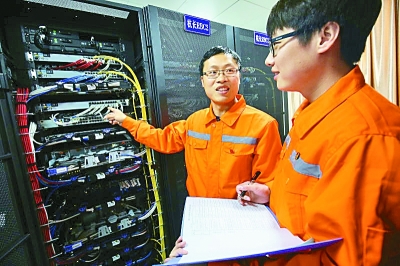 杭州RBC工區(qū)當(dāng)班信號工在巡查RBC服務(wù)器網(wǎng)絡(luò)接口。許文峰攝/光明圖片