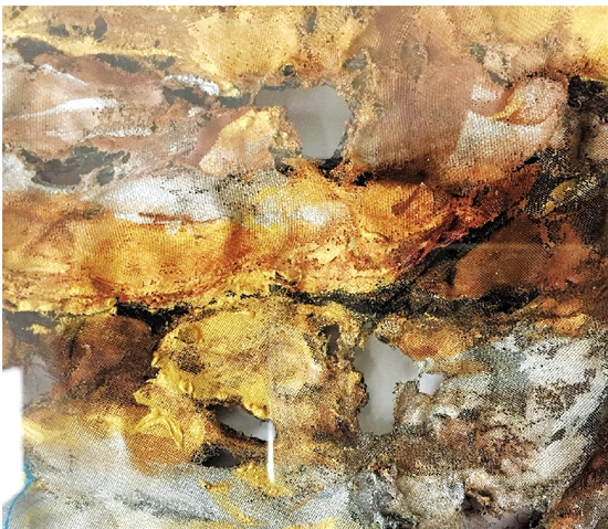 “我當時正在做關(guān)于少數(shù)民族和部落文化的研究,一些地方還保留著舊時的信仰,文化和風俗習慣。有些古物有著上百甚至上千的歷史,還是依舊出色。所以我設(shè)計和制作了三件紡織作品,用粉撲沾粘劑和之后的焚燒歐根紗布料來象征腐蝕和衰敗感,中間幾處金色代表內(nèi)在價值?!扁指嬖V筆者,“我大概花了一周的時間來選相框,上交作品那天其實心里很忐忑,又開心又緊張,開心的是我看到了別的同學上交的作品大多是畫,我的作品不管材料風格都和別人不一樣,緊張的是因為他們畫得實在太好了,競爭有點大。當時覺得應該可以得個小獎,但真沒想過會拿第一名?!?/p>