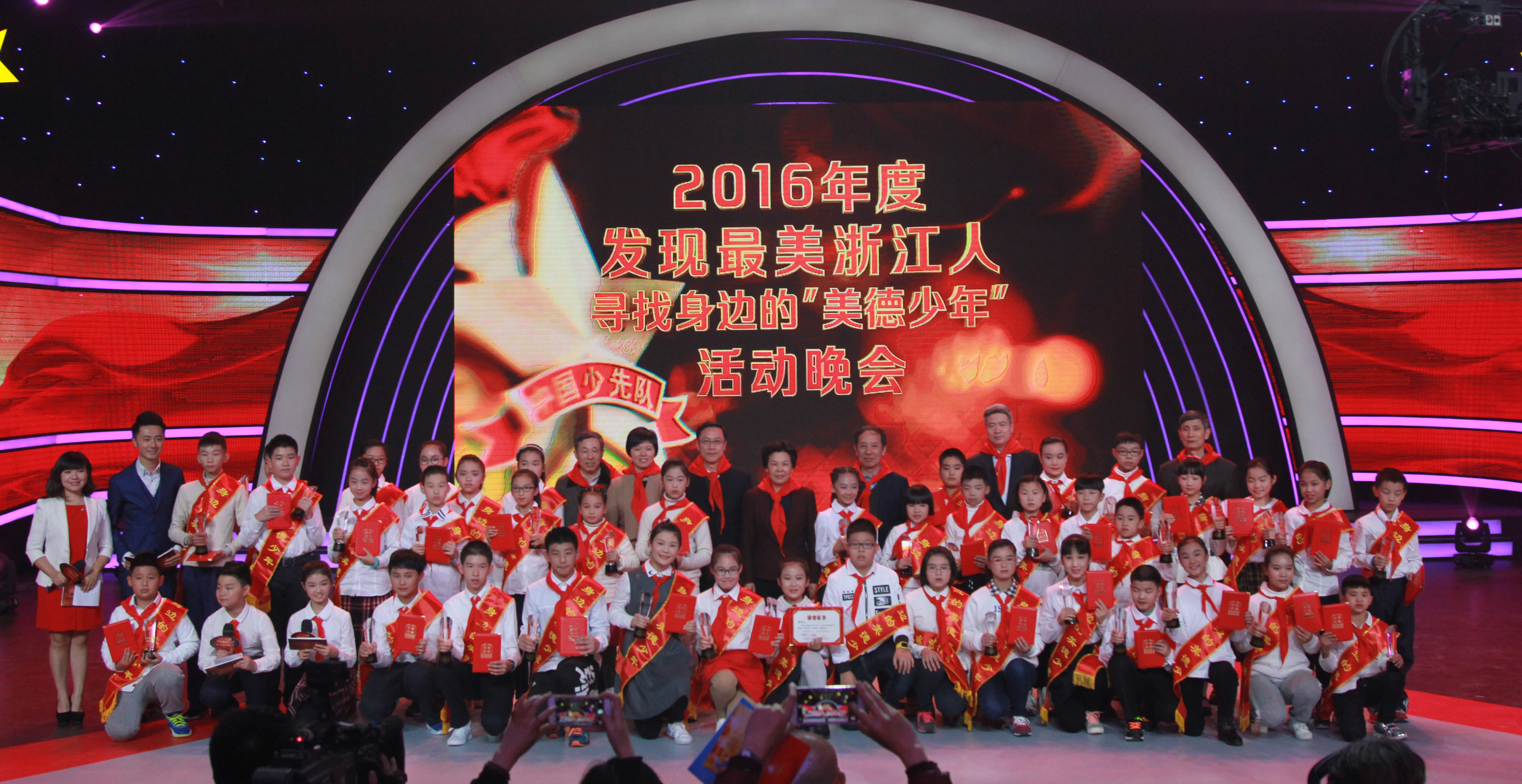 11月23日晚,由浙江省文明辦、團省委、省廣電集團聯(lián)合舉辦的“2016年度發(fā)現(xiàn)最美浙江人——尋找身邊的美德少年”活動晚會在浙江廣電集團演播廳舉行。晚會圍繞“紅領(lǐng)巾相約中國夢,爭做三有三熱愛好少年”的主題,分“夢想的種子、品格的種子、學(xué)習(xí)的種子”三個篇章展開,現(xiàn)場揭曉了2016年“最美浙江人·身邊的美德少年”40名獲獎?wù)呙麊危ㄟ^“美德少年”候選人事跡展播、現(xiàn)場采訪等形式,引導(dǎo)廣大少年兒童學(xué)習(xí)“最美人物”,唱響“最美聲音”,傳遞“最美精神”,以“最美精神”引領(lǐng)少年兒童的“中國夢”。