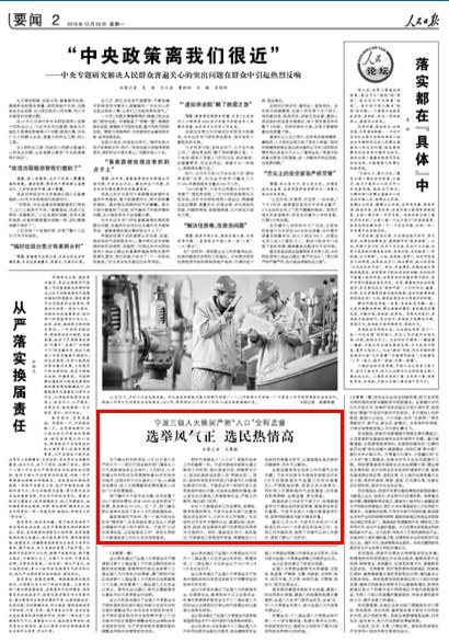 人民日?qǐng)?bào)、光明日?qǐng)?bào) 同時(shí)刊登點(diǎn)贊寧波選舉的文章,人民日?qǐng)?bào)第2版報(bào)道的題目為《寧波三級(jí)人大換屆,嚴(yán)把“入口”全程監(jiān)督, 選舉風(fēng)氣正,選民熱情高 》,光明日?qǐng)?bào)第4版報(bào)道的題目為《選出值得信任的人 ——寧波市縣鄉(xiāng)兩級(jí)人大換屆選舉進(jìn)行時(shí)》。