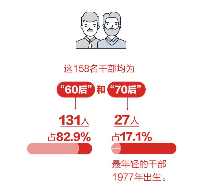 在這158名干部中,男性132人,占83.5%;女性26人,占16.5%,女干部大部分為“60后”,“70后”有4人?! ∽钅贻p的女干部1974年出生。