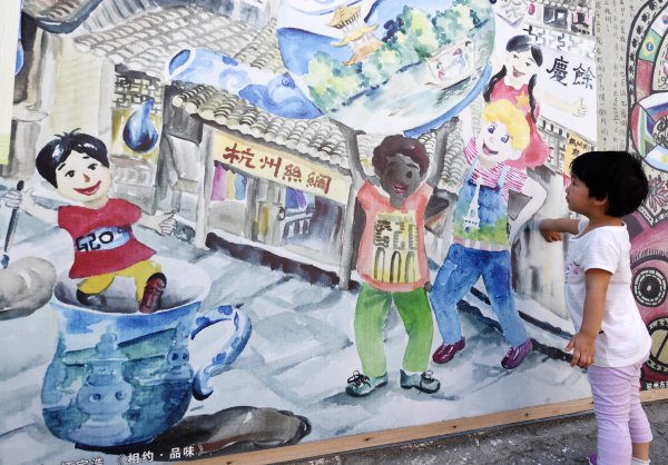 8月28日,一個(gè)小朋友在杭州賣魚橋小學(xué)教育集團(tuán)霞灣校區(qū)圍墻邊欣賞小學(xué)生創(chuàng)作的G20主題繪畫。