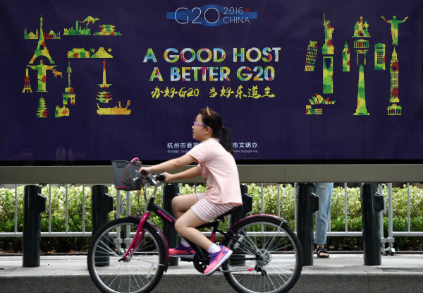 8月27日,兩位行人從杭州街頭一處G20宣傳畫前走過。