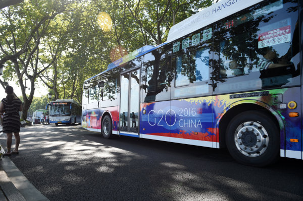 8月28日,車身印有G20杭州峰會(huì)標(biāo)志的電動(dòng)公交車行駛在杭州西湖邊。