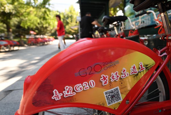 8月28日,在杭州一處公共自行車租賃點(diǎn),公共自行車貼上G20宣傳語。