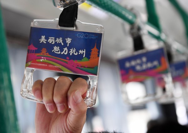 這是杭州一輛公交車扶手上的G20宣傳語(8月27日攝)。