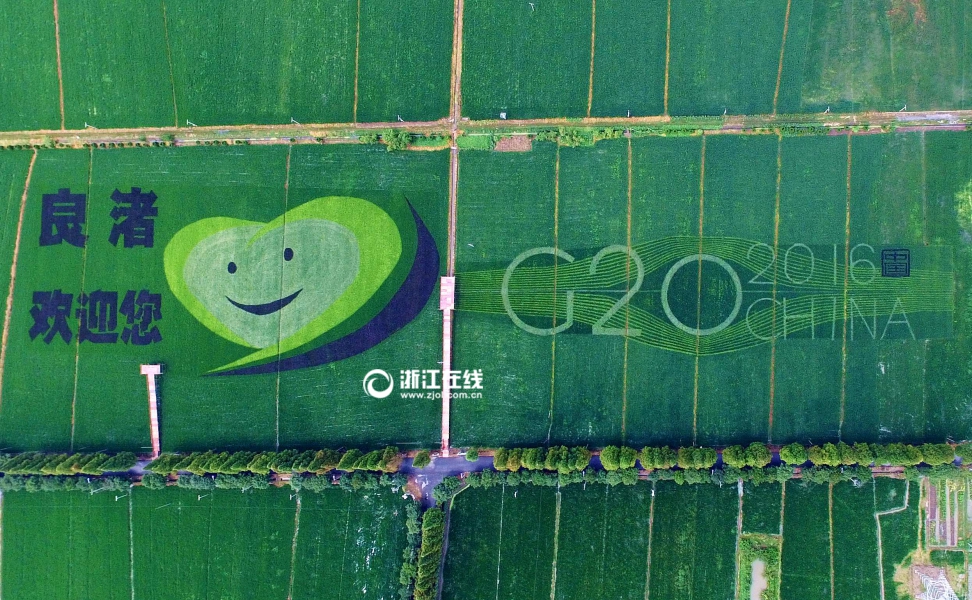 這也許是杭州最文藝的稻田了,從空中俯瞰余杭區(qū)良渚街道大陸村糧食功能區(qū)的千畝稻田,一個(gè)寬逾百米的G20峰會(huì)LOGO和巨大的“良渚歡迎您”卡通笑臉圖,已經(jīng)清晰地呈現(xiàn)于大地之上。據(jù)悉,這是浙江大學(xué)水稻專家張彬領(lǐng)銜的科研團(tuán)隊(duì)用自主研發(fā)的五彩水稻秧苗培育成的杰作。8月中旬到9月是水稻葉片顏色最鮮艷的時(shí)候,也是藝術(shù)田最佳觀賞期。