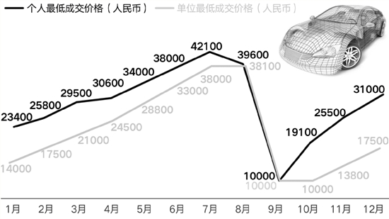 杭州2016年小客車每月競(jìng)價(jià)(最低)曲線變化圖。制圖/龔子皓