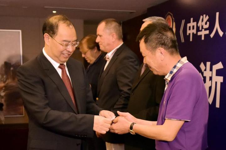 浙江省委常委、省公安廳廳長徐加愛為首批7名浙江外籍人士頒發(fā)外國人永久居留身份證。浙江在線通訊員 周爾博 攝