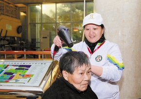 雖然為老人理發(fā)要求不高,但是理發(fā)師們仍然神情專注、一絲不茍,為老人理出清爽利落的發(fā)型?!坝幸恍├先俗喴位蚺P床不起,洗頭就需要三四個人幫忙,胳膊確實有些酸了?!闭跒槔先舜蚶淼闹驹刚咧荟我垒p聲說,“他們就像我的爺爺奶奶一樣,能幫他們把頭發(fā)收拾干凈、清爽,我覺得比什么都快樂?!?/p>