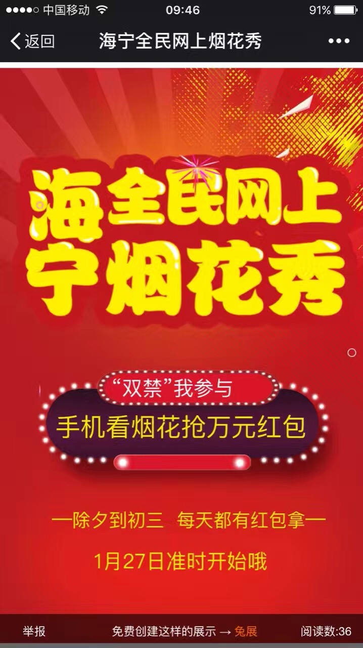 “海寧全民網(wǎng)上煙花秀”的游戲規(guī)則是:網(wǎng)友通過海寧日報旗下的愛海寧APP或微信公眾號“海寧日報”進入游戲,游戲為每名參與網(wǎng)友自動生成獨立游玩頁面。網(wǎng)友只需把頁面分享給微信好友或轉(zhuǎn)發(fā)至微信朋友圈,每日集齊10名“雙禁”支持者,便可兌換1次燃放網(wǎng)絡(luò)煙花爆竹的機會。燃放后,網(wǎng)友可獲得帶有拜年賀詞和現(xiàn)金紅包的福袋?,F(xiàn)金紅包由海寧6家企業(yè)贊助。