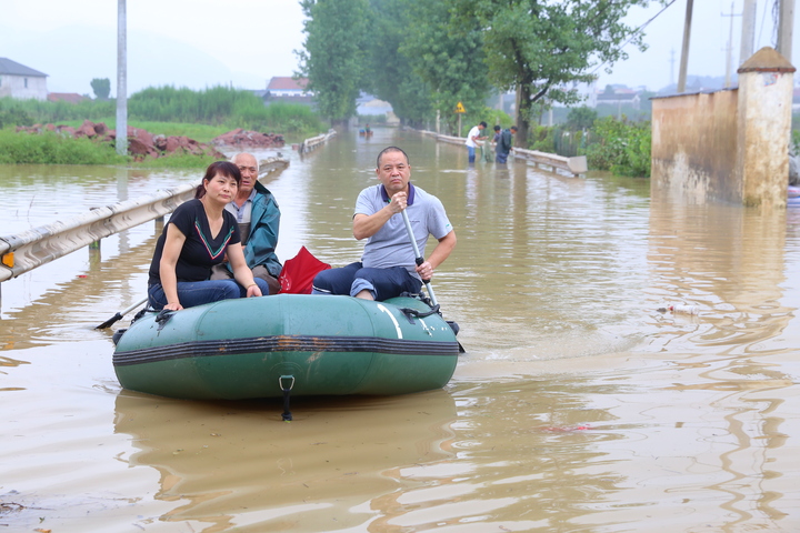 被困的建德三河村村民乘坐前來救援的橡膠船撤離。 浙江新聞客戶端 記者 張孫超 胡元勇 攝