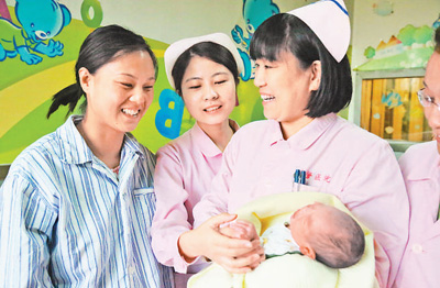 10月4日,在武警河北總隊醫(yī)院婦產科病房,護士長宋海征(左三)正與其他值班護士一起照顧產婦和剛出生的“國慶寶寶”。史自強攝