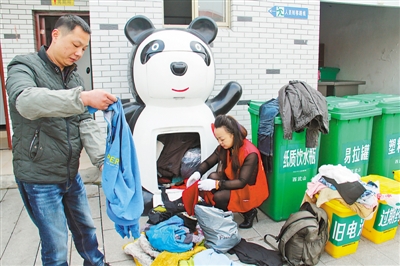 2月20日,在桐廬縣舊縣街道西武山村“雞毛換糖”店,“店小二”在整理回收來的舊衣物。