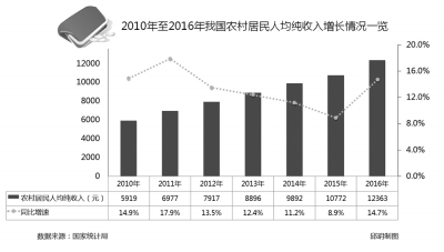窺一斑而知全豹,蒲昌友的經(jīng)歷折射出中國農(nóng)民持續(xù)增收乏力的客觀現(xiàn)實。數(shù)據(jù)顯示,2015年,我國農(nóng)民人均收入突破萬元大關,增幅連續(xù)第6年高于GDP和城鎮(zhèn)居民收入增幅。2016年中國農(nóng)民人均可支配收入12363元人民幣,實際增長6.2%。