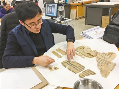 2月17日,在國(guó)家圖書(shū)館南區(qū)一間寬敞明亮的辦公室里,國(guó)家古籍館館員謝謹(jǐn)誠(chéng)小心翼翼地打開(kāi)一個(gè)白色的紙包,呈現(xiàn)在眼前的是一堆破碎不堪的黃色紙片,上面的文字看似漢字但又明顯不是。謝謹(jǐn)誠(chéng)用小鑷子輕輕夾起其中三張碎紙片,上下左右地?cái)[了一會(huì)兒,一張書(shū)頁(yè)的模樣大致出來(lái)了?!皬钠茡p的邊緣看,這三張可能是一頁(yè),所以先放在一起。但也說(shuō)不好,畢竟這是西夏文,不像漢字可以通過(guò)字跡復(fù)原,還要等專(zhuān)家過(guò)來(lái)鑒定?!敝x謹(jǐn)誠(chéng)說(shuō),別看碎成了這樣,比這碎的更厲害的他都修過(guò),他是古籍修復(fù)師。