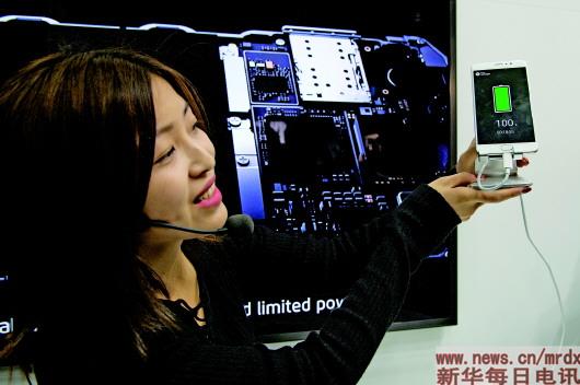 2月28日,在世界移動通信大會上,工作人員介紹一款中國手機(jī)的超級快充技術(shù)?!⌒氯A社發(fā)