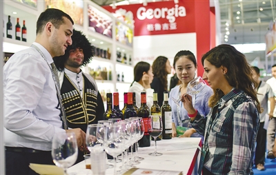 2016年9月24日,第五屆中國—亞歐博覽會在烏魯木齊舉辦。圖為客商在格魯吉亞展位品嘗美酒。新華社發(fā)