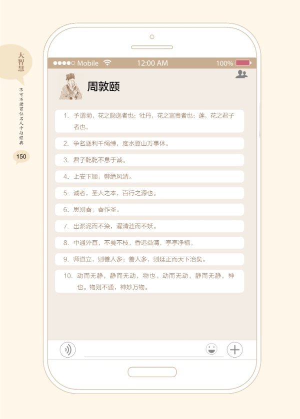3年前,經(jīng)作者授權(quán),浙江人民出版社開始籌備出版事宜。版式,借鑒微信元素,讓讀者感受到手機(jī)閱讀的親切感;內(nèi)容,請(qǐng)畫家作畫,增添名人的民間想象,畫家范曾等欣然手書警句墨寶;同時(shí),考慮到朋友圈的半私密性,征得每個(gè)人同意后,對(duì)圈中好友的頭像及網(wǎng)名進(jìn)行技術(shù)處理,頭像統(tǒng)一采取有版權(quán)的攝影作品代替。