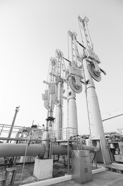 圖為矗立于馬德島原油碼頭的四支巨型卸油臂。李司坤攝/光明圖片