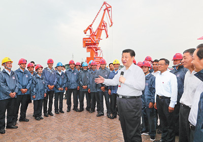 正在現(xiàn)場作業(yè)的碼頭工人看到總書記來了,激動(dòng)地圍攏過來向總書記問好。習(xí)近平同他們親切握手,勉勵(lì)他們愛崗敬業(yè)、爭創(chuàng)一流,樹立和展示當(dāng)代工人階級良好形象。習(xí)近平指出,“一帶一路”建設(shè)是人心所向,我們要在這個(gè)框架下推動(dòng)大開放大開發(fā),進(jìn)而推動(dòng)實(shí)現(xiàn)“兩個(gè)一百年”奮斗目標(biāo)、實(shí)現(xiàn)中華民族偉大復(fù)興。大家要攜手同心,共圓中國夢。總書記熱情洋溢的話語,使在場每個(gè)人都深受感染。