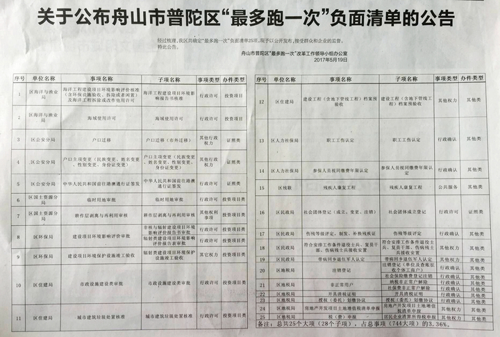 近日,普陀區(qū)在全省率先公布"最多跑一次"負(fù)面清單,共包含25個事項,占全區(qū)744個總事項的3.4%。其中行政許可事項9個,占257個行政許可事項的3.5%。
