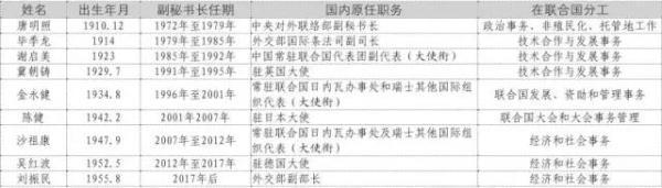 根據(jù)聯(lián)合國的有關(guān)規(guī)定,5個常任理事國都可由各自政府推薦一人擔(dān)任聯(lián)合國副秘書長。中國自20世紀(jì)70年代初恢復(fù)在聯(lián)合國的合法席位以來,還有7位資深外交官赴紐約出任該職(見下表)。