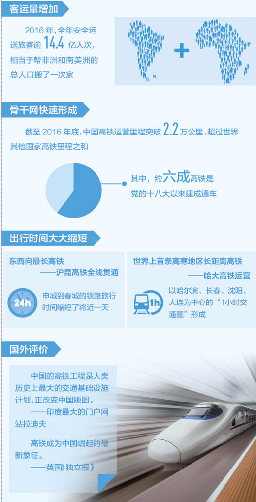 高鐵客運(yùn)量的增加,有賴于高鐵骨干網(wǎng)的快速形成。十八大以來,中國高鐵進(jìn)入了大規(guī)模投入運(yùn)營的階段。截至2016年底,中國高鐵運(yùn)營里程突破2.2萬公里,超過世界其他國家高鐵里程之和,其中約六成高鐵是黨的十八大以來建成通車的,特別是中西部高鐵從無到有,實現(xiàn)了中國高鐵由“線”到“網(wǎng)”的飛躍,讓中西部與東部之間的出行時間大幅縮短。