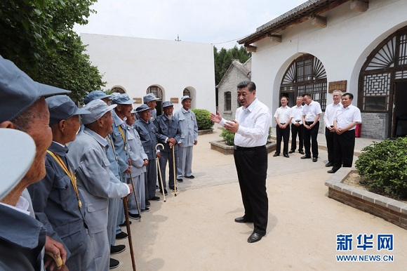 習(xí)近平來到興縣晉綏軍區(qū)司令部舊址,同當(dāng)年在晉綏邊區(qū)參加對敵斗爭的老戰(zhàn)士們親切交談。新華社記者 龐興雷 攝