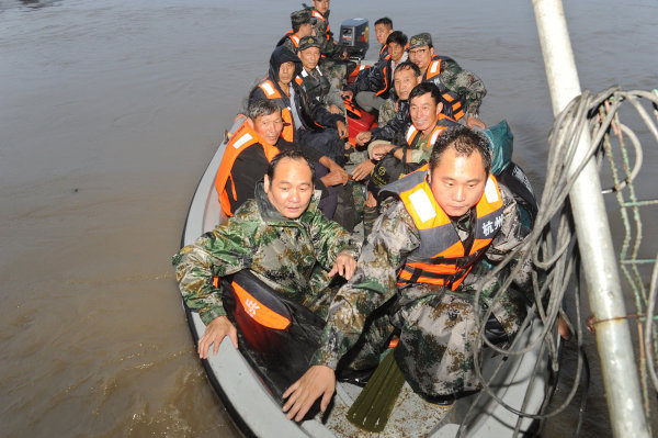 6月25日,民兵駕駛沖鋒舟轉(zhuǎn)移杭州西湖區(qū)雙浦鎮(zhèn)長(zhǎng)安沙島上的養(yǎng)殖戶(hù)。浙江新聞客戶(hù)端記者 吳元峰 通訊員 王建軍 攝